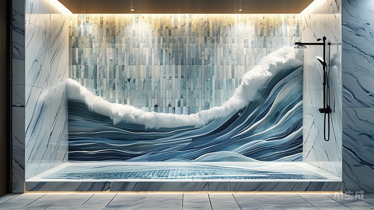 卫浴空间追求放松惬意,大理石纹瓷砖在此大展身手。竖向铺贴大片石材纹理砖,模拟天然石壁效果,磅礴大气自成气场。从天花板垂落的目光顺着垂直线条滑落至地面排水口,宛如瀑布飞泻而下,强化了纵向的空间纵深感。淋浴区单独分区后,内部用马赛克碎拼出渐变色的海浪波涛图案嵌入其中,水流滑过起伏不平的表面,与虚拟海浪相互呼应,虚实相生间营造海洋主题泡澡体验。每一次踏入卫生间,都似开启一场海滨度假之旅。