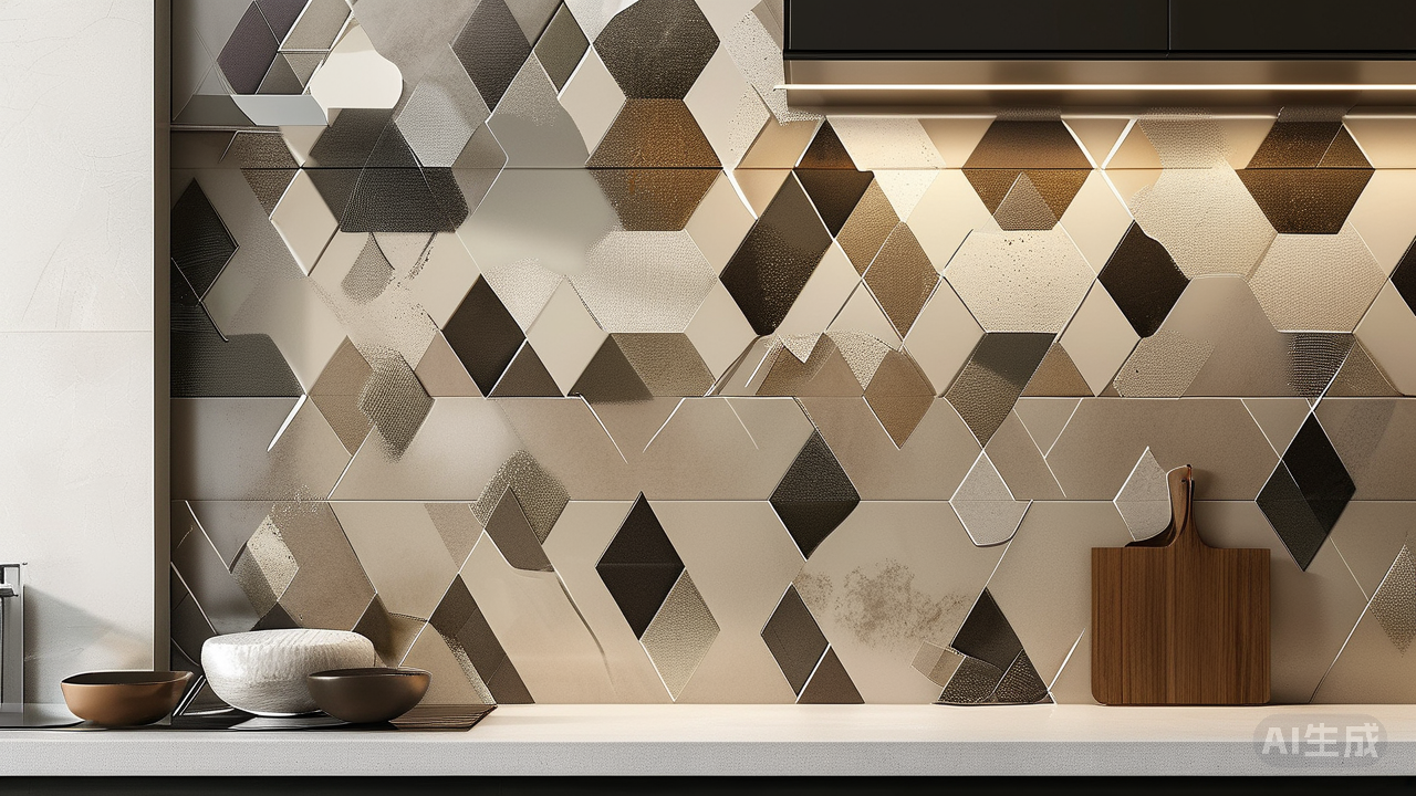 几何图案,增添现代气息几何图形以其简洁明快的特点,成为现代风格装修的首选元素之一。无论是六边形、菱形还是方形的特殊规格瓷砖,都能为厨卫空间带来独特的节奏感和动感。特别是带有微妙渐变或金属光泽的几何图案瓷砖,更能彰显出高级感和科技感。在厨房操作区上方使用小尺寸的马赛克瓷砖拼贴成有趣的图案,如波浪线、格子或是抽象图形,既实用又具装饰性;卫生间则可以利用大尺寸的几何图案地砖来延伸视觉空间,配合简洁线条的洁具,展现利落干练的现代美学。