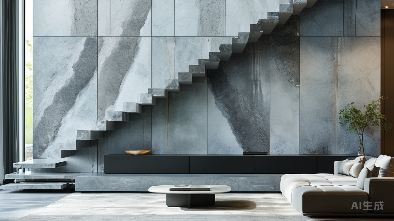 更令王总倾心的是楼梯踏步的呈现。整块岩板以利落的几何线条切割成型,无需传统收边条的遮挡,边缘锐利如笔锋勾勒。踏步精准咬合,直角转折处干净利落,在灯光下形成极具张力的明暗交界。岩板的物理硬度与可塑性,使其能承载最精准的切割与倒角,赋予设计所渴求的、宛如刀削斧劈的清晰轮廓。空间的“骨相”,由此被精妙雕塑。