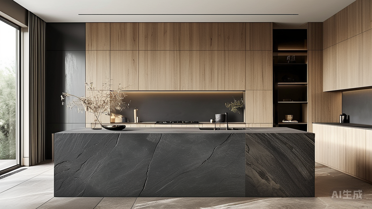 当一面电视背景墙被整块哑光质感的冰川白岩板无缝覆盖,其天然石材般的细腻纹理在光线下静静流淌,瞬间成为视觉焦点。无需繁复造型,仅凭材质本身的纯粹美感与整幅铺贴的恢弘气势,高级感便油然而生。同样,在开放式厨房,一张超长的哑光深色岩板岛台如同雕塑般矗立,冷峻的线条与温润木饰面形成质感对话,岩板卓越的耐磨与耐污性能更使其成为优雅生活的坚实底座。 岩板在现代轻奢空间中的魅力,在于其与线条美学的高度共生: