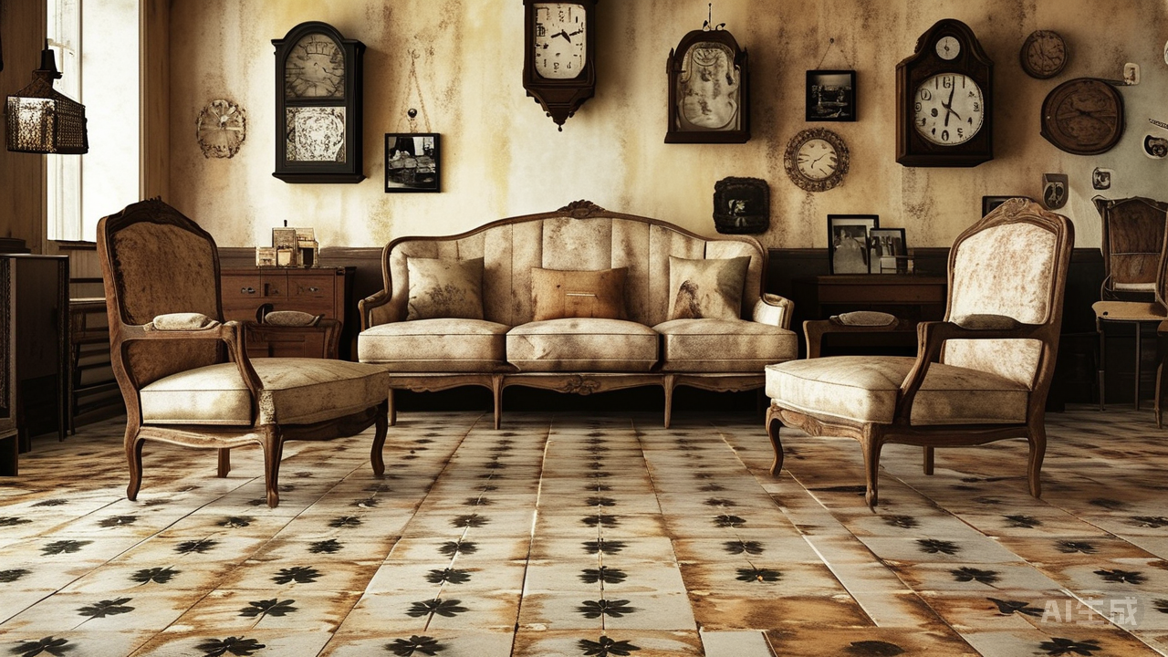 * **大面积铺陈木纹砖:** 作为客厅主要地面材质,木纹砖提供温暖包容的基底色调,其自然的木质纹理能中和花砖的繁复,使空间不至于过度喧闹,达到视觉平衡。 * **墙面局部呼应:** 可将小花砖延伸至电视墙局部、壁炉立面或作为腰线装饰,与地面形成巧妙呼应,强化复古主题。