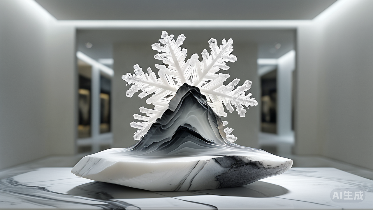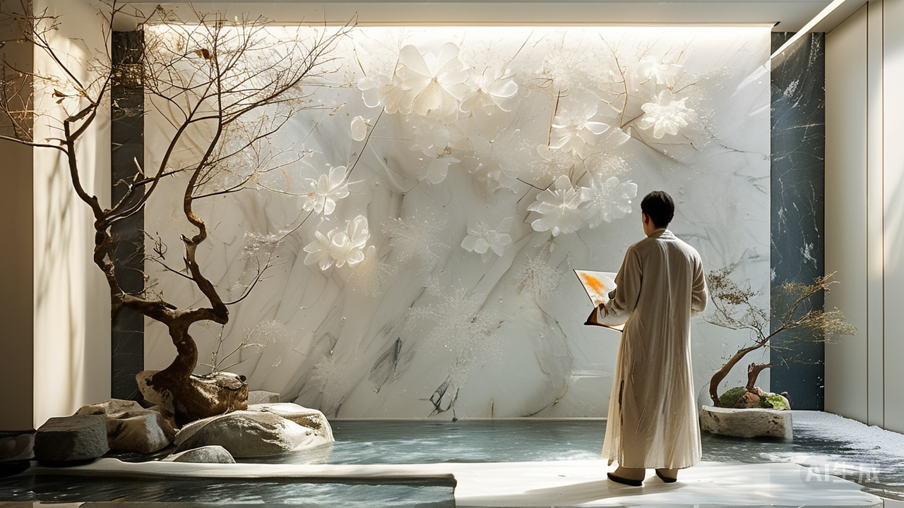 二、 光影雕刻师:天然纹理的诗意叙事 “在顶级空间叙事中,原石是无可替代的光影导演,”照明设计师陈墨白如此强调。他打开平板,展示一幅雪花白大理石在灯光下呈现的惊人效果:光线穿透半透明的石体,内部灰黑色的天然纹路如山水画卷般缓缓舒展、流动,在空间中投射出朦胧而写意的光晕。“每一块都是大自然独此一件的‘光影剧本’。在杭州那处私人艺廊设计中,我特意为一块雪花白大理石定制了背光系统——当灯光亮起,石材不再是冰冷的立面,瞬间化身流动的光之诗行,让空间情绪随光影起伏低昂。”