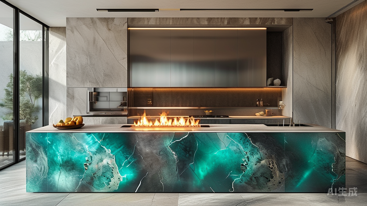 功能主义:科技赋能的诗意栖居 意大利制造的精髓在于实用与美学的量子纠缠。大规格岩板经万吨压机与1260℃煅烧,硬度超莫氏7级,咖啡渍与油彩在纳米级釉面无处遁形。开放式厨房的中岛以整块12mm超薄岩板悬挑而出,墨玉黑台面倒映着不锈钢厨具的冷光,耐刮擦特性让烹饪成为一场视觉表演。壁炉立面采用防火岩板,冷翡翠纹理与跳跃火焰构成冰与火的和鸣。科技让材料褪去娇贵外衣,在人间烟火中绽放永恒之美。