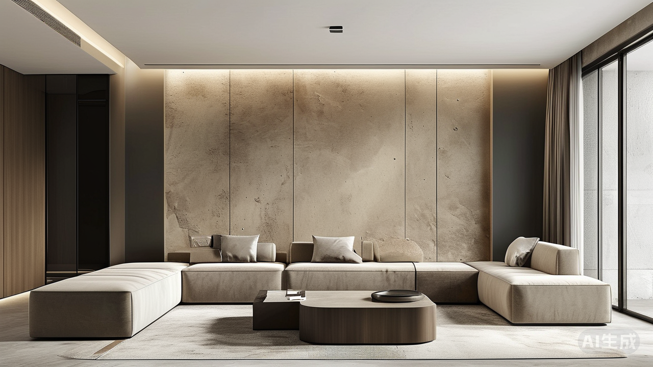 肌理,含蓄微妙为上: 若有纹理,请选微水泥、砂岩或极细颗粒效果。纹理过度则显粗粝,克制而细腻的肌理如同指尖抚过绸缎的暗纹,隐于底色之下却增添触感深度,喧宾夺主的夸张纹路只会撕裂奶油风的宁静。