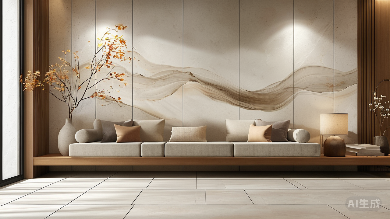 连纹,则是打破边界的视觉魔法。 当单片瓷砖的纹理在精心设计与铺贴下无缝延续,空间便挣脱了传统铺贴的割裂感。纹理如泼墨般流淌过整个立面或地面,仿佛一整块天然石材被温柔安放。这流动的视觉韵律,模糊了空间的分隔,营造出开阔通透的整体感。一面连纹墙,便是一幅宏大的天然画卷;一片连纹地,便延伸了步履丈量的无限可能。连纹,让空间在视觉上挣脱了束缚,拥有了自由呼吸的旷野。